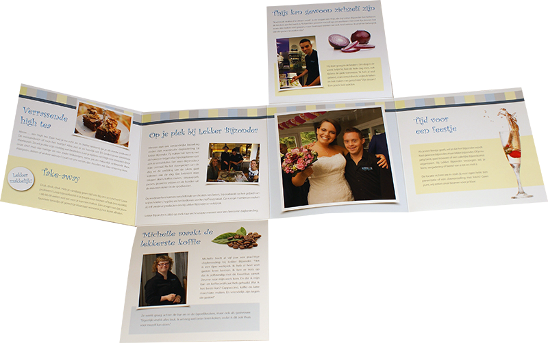 Voor de opening van een restaurant waarbij mensen met een beperking in de bediening en keuken werken, moets een speciale folder gemaakt worden. Het reclame bureau heeft een bijzondere introductiefolder bedacht, waarbij steeds weer verder gaat met het openvouwen en lezen van de info. Hierbij zijn de rillijnen en stanslijnen van groot belang. Als deze niet goed gepositioneerd zijn kan de folder niet volledig gevouwen worden. Drukwerkcoaching heeft hierbij gezorgd dat dit allemaal exact klopt en men is dan ook razend enthousiast over het eindresultaat. Ook hierbij is keuze van het papier en de looprichting belangrijk. Uiteraard geven we op voorhand hiervan een blanco model zodat dit vooraf duidelijk is.
